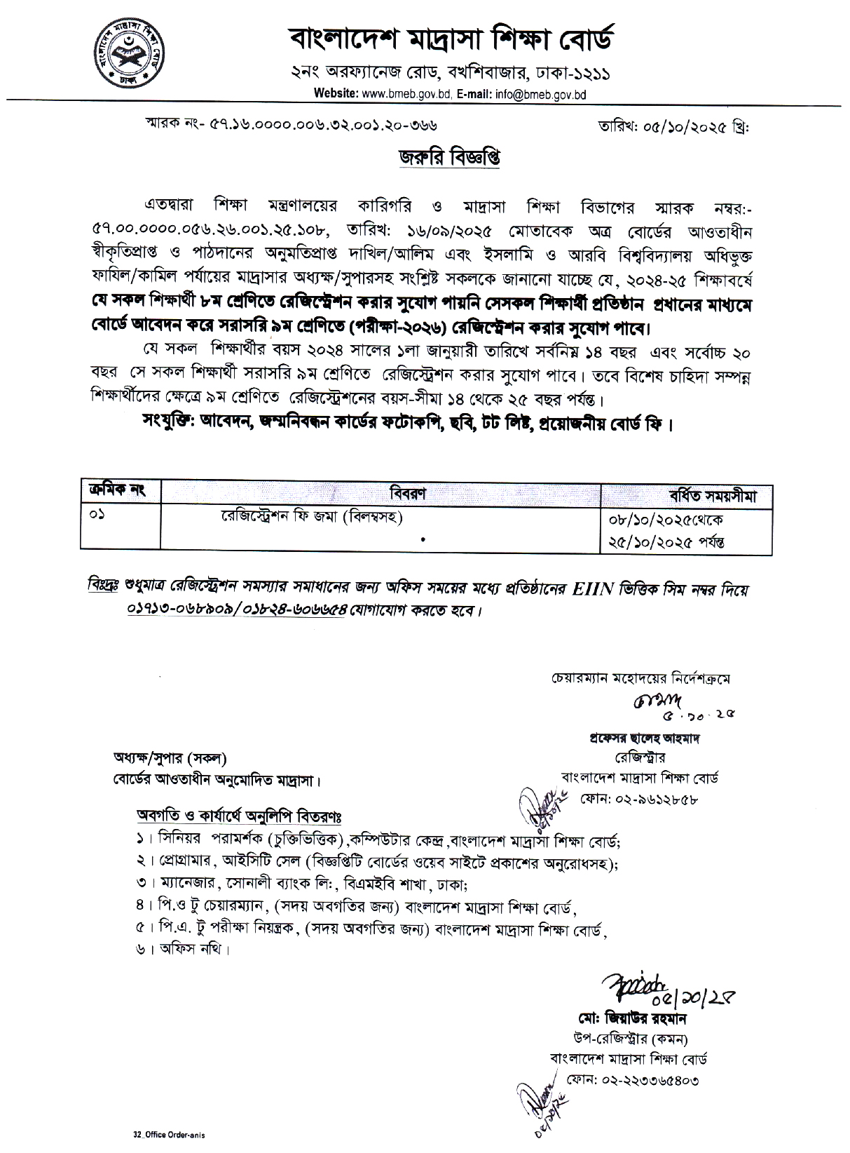 ২০২৫ সালের ৬ষ্ঠ ও ৮ম শ্রেণির রেজিস্ট্রেশনের সময় বৃদ্ধি সংক্রান্ত বিজ্ঞপ্তি। |